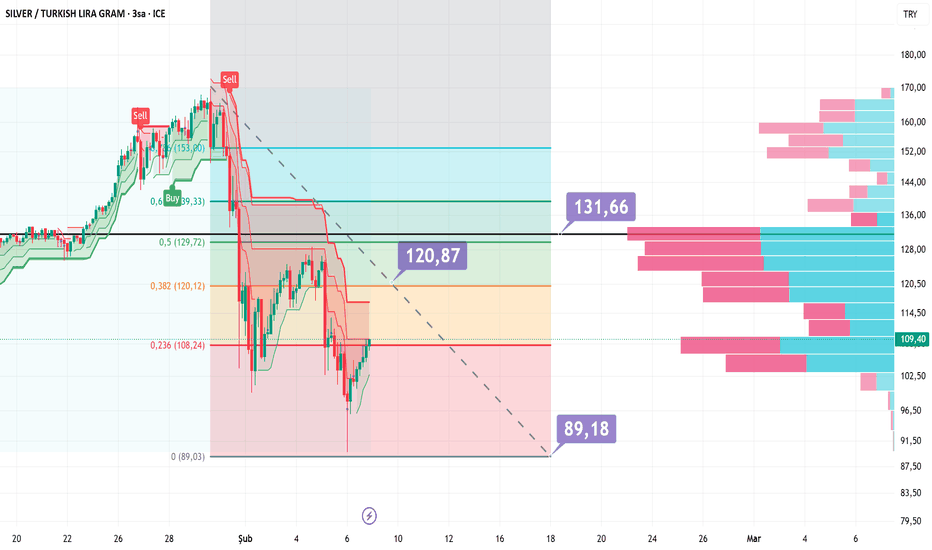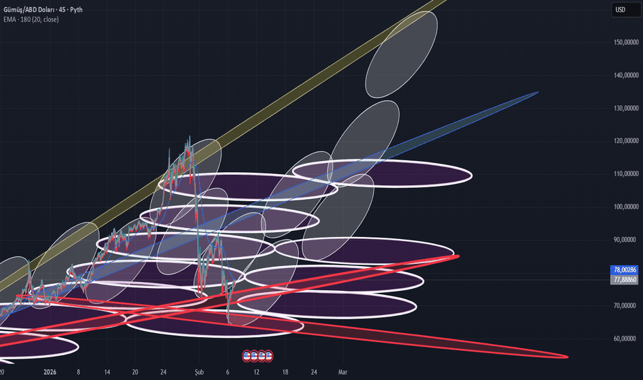Silver (2H)Silver için 2 saatlik grafikte, fiyatın geçmişteki yükselen ana trendini 120 bölgesinden aldığı dirençle aşağı yönlü kırdığı ve düşen kanal içerisinde hareketine devam ettiği görülmektedir. Trend kırılımı sonrası 110–95 destekleri kaybedilmiş, düşüş 64 seviyelerine kadar sürmüştür.