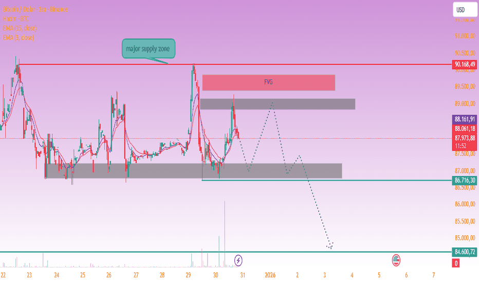 BTC, 90.000 civarındaki ana arz bölgesinden sert şekilde reddedildi ve güçlü satış baskısı teyit edildi. Fiyat EMA’ların altında işlem görüyor ve düşüş yapısı korunuyor. FVG bölgesine doğru bir tepki yükselişi mümkün, ancak 90.200 geri kazanılmadıkça 86.700 ve 84.600 hedefleri geçerliliğini