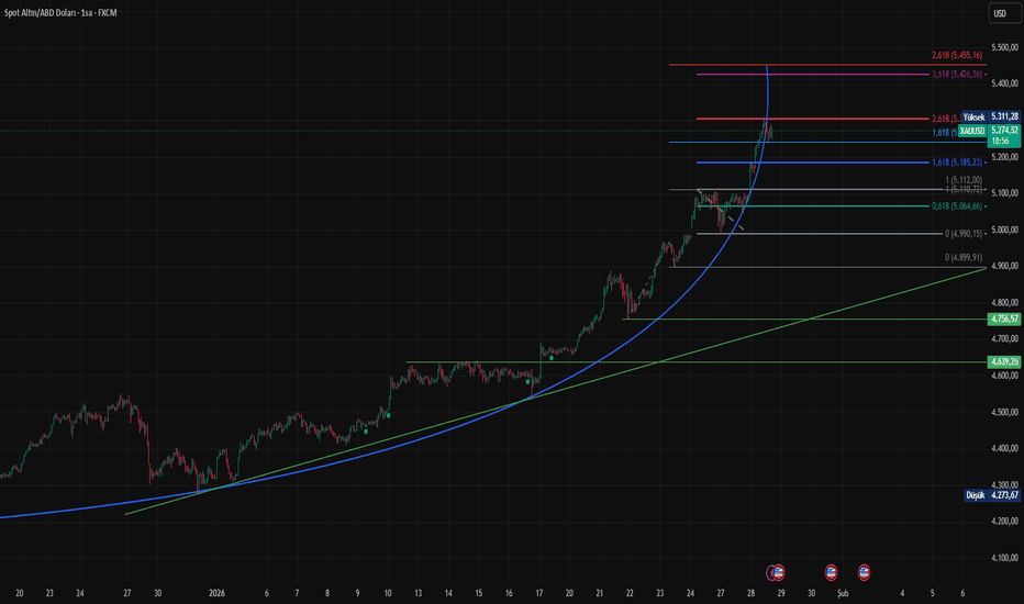 XAU (Altın) TehlikeliAn itibari ile 5,276$ fiyat bandında hareket eden XAU (Altın) grafikte belirtmiş olduğumuz 5,300$ hedef fiyat bandına yükselişini gerçekleştirmiş görünüyor. Teknik haftalık ve aylık olarak süper trend içerisinde hareketlerini gerçekleştiren altın (XAU) şahsım adına miadını doldurmuştur. Grafikte bel