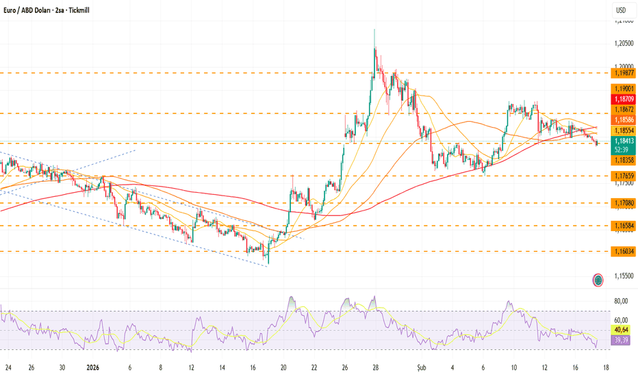 Parite 1.19 zirvesi sonrası düzeltme sürecinde ve şu an 1.1840 bölgesinde yatay–zayıf bir görünüm sergiliyor. Kısa vadede hareketli ortalamaların altında fiyatlama dikkat çekiyor.