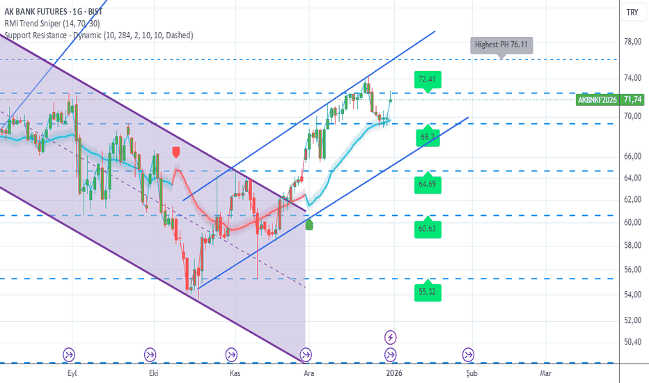 Akbank Futures Vadeli de son durum!!!Akbank futures, vadeli günlük grafikte, yükselen kanal içerisinde 72 TL seviyesindeki direnç bölgesini aşamayarak bir miktar geri çekildi.69 TL seviyesine doğru gerileyebilir.Bu seviyeden de güçlü bir destek alarak yoluna devam edebilir.Hatta yükselen kanal alt bandına kadar da geri çekilebilir.Kana