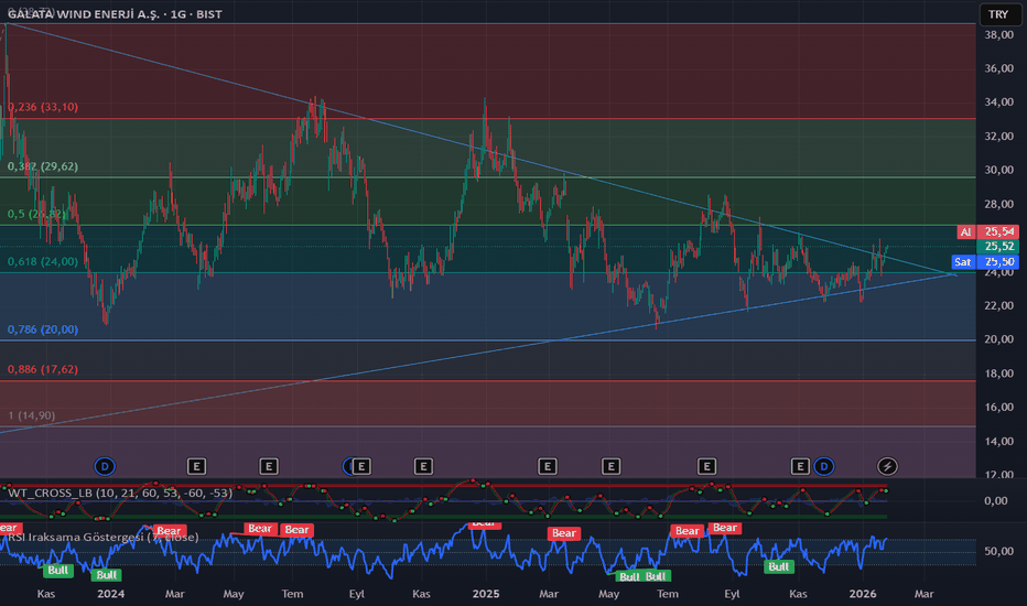 GWIND – Uzun Vadeli Simetrik Üçgen Kırılımına Doğru mu?2023’te 14 → 33,7 TL arası güçlü bir impuls sonrası hisse yaklaşık 1,5 yıldır geniş bir simetrik üçgen içinde düzeltme yapıyor.