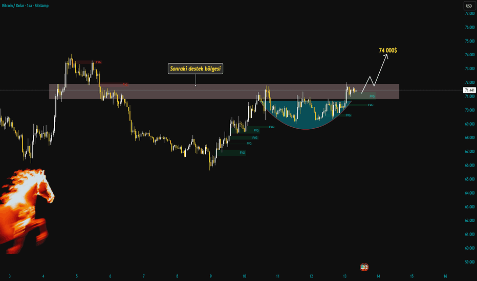BTC Holding Temel Desteği – Yükseliş Devam EdiyorH1 zaman diliminde Bitcoin, uzun bir düzeltme aşamasından sonra yapısal iyileşme belirtileri gösteriyor. Fiyat, daha önce büyük bir direnç seviyesi olarak görev yapan 70.000 – 71.000 civarındaki kilit destek bölgesinin üzerinde tutunarak net bir yuvarlak birikim modeli oluşturdu.