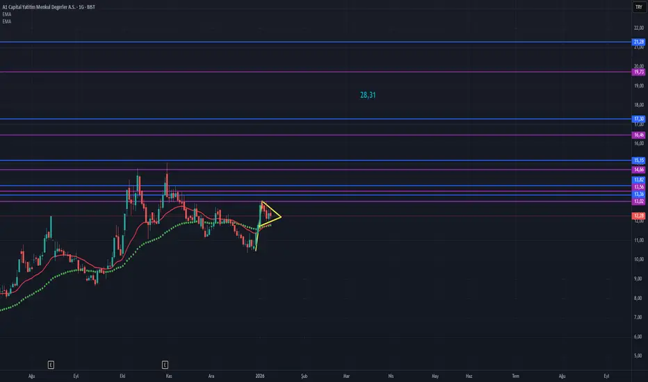 Grafikte Flama formasyonu olmakla beraber hedefler fibonacciye göre çizilmiştir.Formasyon şartı olarak sarı çizgi üzeri kapanışlar arayalım.