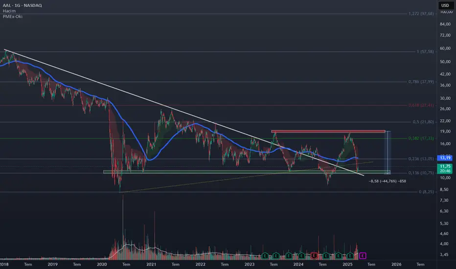 2025 yılına %45lik düşüşle başlayan American Havayolları, SMA200 altında hareket etse de, fib0,136 değier olan yeşil kutusundan yine tepki almış gibi duruyor. 2024 sonrası sma200 ilişkisini sonlandırmış gibi göründüğünden bu hususa dikkat vermiyoruz :(