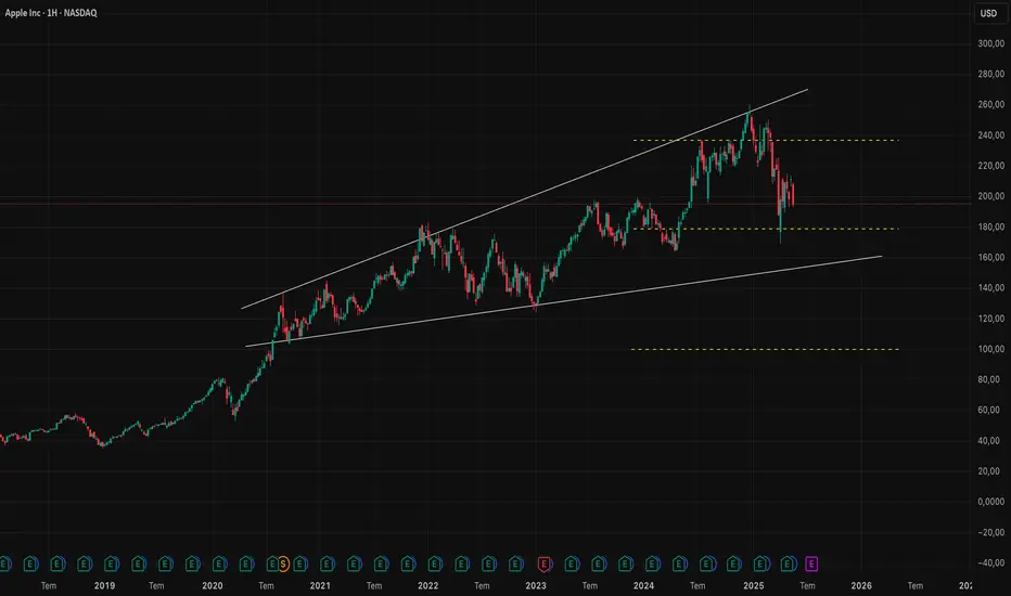 Apple (AAPL), uzun vadeli yükselen kanalın üst bandından sert şekilde geri çekildikten sonra 195 dolar civarında tutunmaya çalışıyor. Ancak fiyat yapısı, yukarı yönlü hareketlerin geçici kaldığını ve mevcut durumun zayıf bir tepki yükselişi olduğunu gösteriyor.