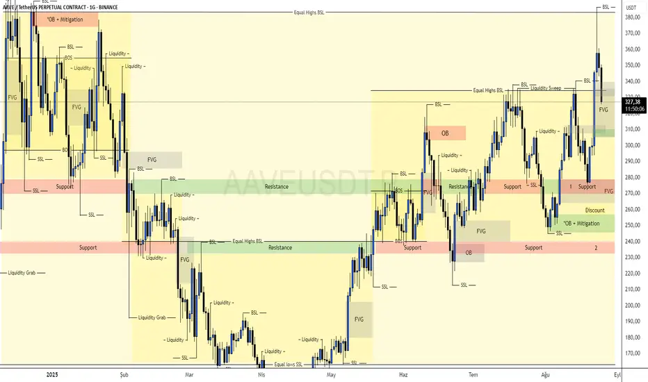 AAVE ,305–310$ seviyesindeki yeşil alandan dönüş yakaladı ve gri alan 335–340$ a ulaştı.Bu seviyenin üzerinde gelecek kapanışlarla yükselişin devam etmesini bekliyorum.Ancak ETH ve BTC de tepkilerin zayıf kalması nedeniyle dikkatli olunmalı.