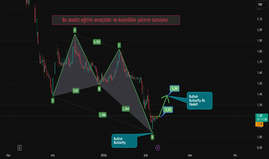 ADESE hissesinde; kendi oluşturmuş olduğum "Harmonic Patterns with Potential Detection-Premium" indikatörü Harmonik Butterfly Patterni tespit etti. Harmonikler grafikler üzerinde güzel çalışan formasyonlardır. Dipte oluşmuş bir Harmonik'te fiyat yukarı doğru hareket etme eğilimindedir. Buradaki Butterfly Harmoniği de dipte oluşmuş ve devamında yükseliş beklenmektedir ve olası hedefi 1,39 ₺' dir. Fiyatın hedefe gidebilmesi için 1,19 ₺ üzerinde kalması önemlidir.