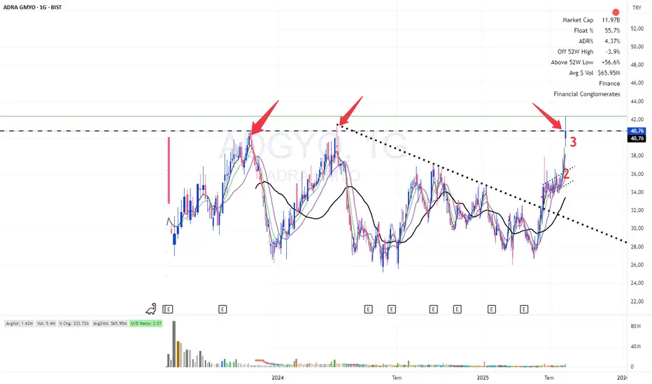 ADGYO önce haziran ayında düşen trendi kırdı. (1) Sonrasında da yeni bir yükseliş hareketi başlattı diyebiliriz. Özellikle yükselen kanalın kırılmasıyla (2) artış hızının arttığını görüyoruz. Önümüzde sadece son direnç olan 40.76 tl bölgesi kaldı. Cuma günü bu bölge zorlansa da kararsız bir mum yapısıyla karşı karşıyayız.(3) Risk getiri oranı anlamında çok doğru bir trade olabileceğini düşüyorum.