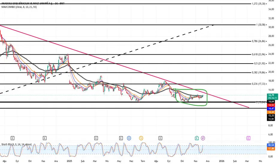 anadolu efes altta 13 yukarda 16 tl arasında dar bantta hareket ederken diple düşen trend arasında sıkışma mevcut orta uzun vadede 19 -24-27 tl hedef bölgesi olarak takip edilebilir