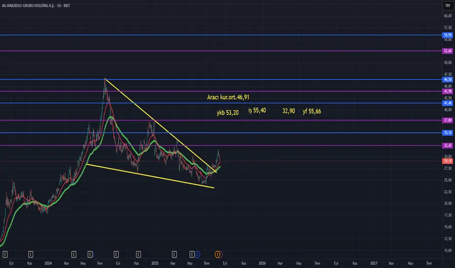 6 Aylık bilanço geldi eder fiyat 32,90.Teknik anlamda fiyatlar 22 ve 50 ema nın üzerinde old.sürece yön yukarı.(Bahsettiğim hareketli ort.izsüren kabul edebiliriz.) Hedefler fibonacciye göre çizilmiştir.