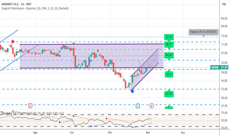 Akbank, günlük grafikte mikro kanal içerisinde, ufak adımlarla yükselişini sürdürmektedir.61 TL nin üzerinde kalması durumunda, majör kanal içerisinde ilerleyişini devam ettirebilir.68 TL direnç seviyesini de test edebilir.Geri çekilmelerde, alt bandın altına sarkmadığı sürece, yukarı yönlü atak da yapabilir.Fibo destek ve direnç seviyeleri ile takip edilmelidir.Teknik analiz, temel analiz verileri ile de desteklenmelidir.Yatırım tavsiyesi değildir.