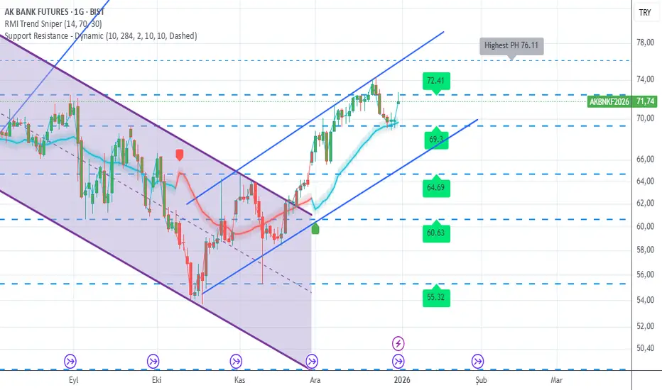 Akbank futures, vadeli günlük grafikte, yükselen kanal içerisinde 72 TL seviyesindeki direnç bölgesini aşamayarak bir miktar geri çekildi.69 TL seviyesine doğru gerileyebilir.Bu seviyeden de güçlü bir destek alarak yoluna devam edebilir.Hatta yükselen kanal alt bandına kadar da geri çekilebilir.Kanal alt bandı seviyesinin de altına sarkmadığı sürece, yukarı yönlü ilerleyişini sürdürebilir.Geri çekilmeler, teknik dahilin de alım fırsatı olarak da görülebilir.Teknik analiz,temel analiz verileri ile de desteklenmelidir.Yatırım tavsiyesi değildir.