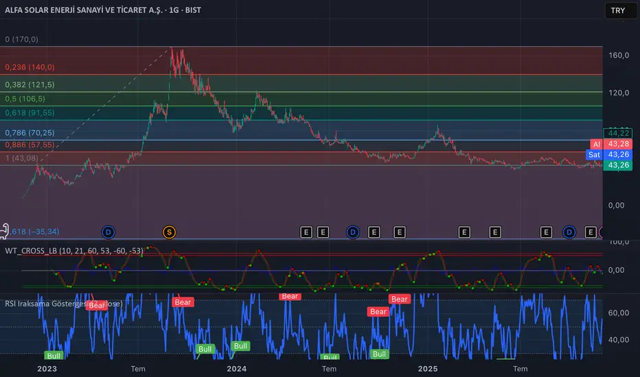 ALFAS grafiğine günlük (1G) periyotta baktığımızda, teknik analizin en kritik seviyelerinden biri olan Fibonacci 1 (43.08 TL) noktasına geri döndüğümüzü görüyoruz. Hisse, zirveden başlayan düzeltme sürecinde tüm kazanımlarını geri vererek "başlangıç noktasına" temas etmiş durumda.