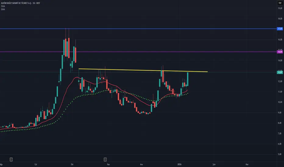 Grafikte Tobo formasyonu formasyonu olmakla beraber formasyon şartı olarak sarı çizgi üzeri kapanışlar arayalım.İlk hedef çıkışın fibo 1.414 denk gelen 14.84 seviyesi bu seviyenin üzeri kapanışlar görmemiz durumunda ana hedef 17.05.