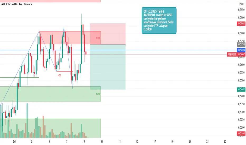 09.10.2025 Tarihi #APEUSDT analizi 0.5750 seviyelerine gelirse shortlamak isterim 0.5450 seviyeleri TP .stopum 0.5858