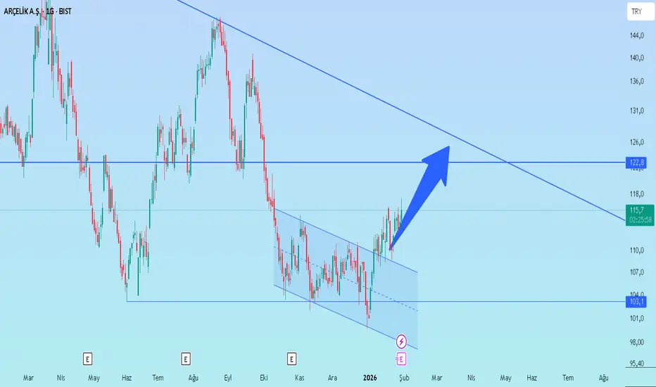 Ok ile belirttiğim gibi, yükselişin ilk ciddi durağı 122.8 TL yatay direnci ve hemen üzerindeki ana düşen trend çizgisi olacaktır.