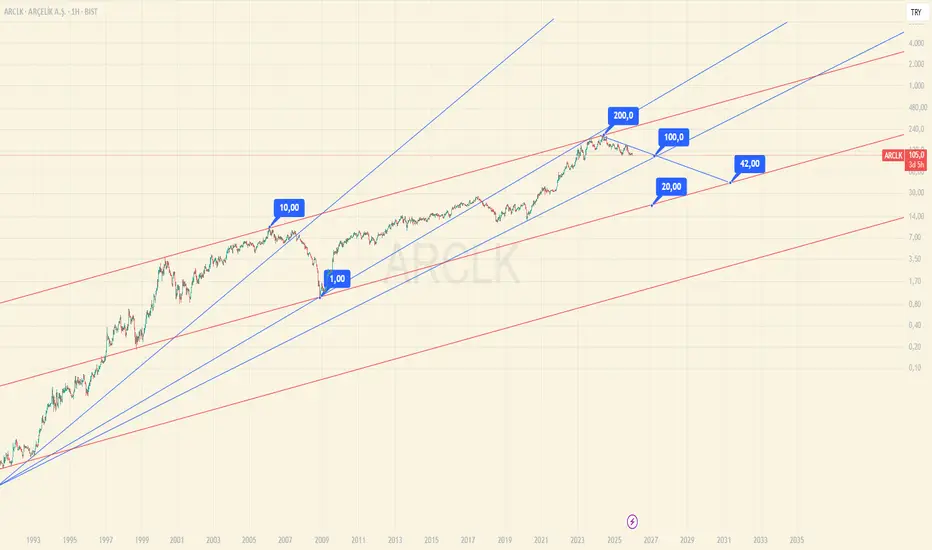 ARCLK için 1991’den günümüze uzanan, tam 34 yıllık devasa bir perspektifi önünüze seriyorum. Logaritmik ölçekte baktığımızda, hissenin on yıllardır içinde dans ettiği o meşhur kanal yapılarını net bir şekilde görebilirsiniz.