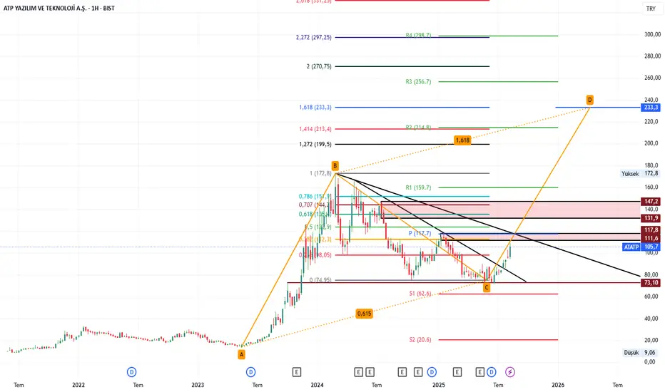 ATATP yazılım hissemiz düşeni kırmış ve ABCD formasyonu olarak karşımıza çıkmış durumda teknik olarak göstergelerimizden 14 adet hareketli ortalama göstergemiz Al sinyali vermekte, grafik olarak 1.bölge olarak belirttiğim kanal fiyat aralığı takip edilmeli 111.7-117.7 118 pivot bölgesinin geçilmesi ve üzeri kalıcılık ile 2.bölge olarak belirttiğim 131.9-147.2 kırmızı kanal bölgesi geçilmesi gerekecektir, ardından zirve fiyat172.8 sırasıyla üzeri kapanışlar ABCD formasyonu hedefi yani 233.3 dür. Formasyon modülü 0,618-1618 ABCD formasyonudur.