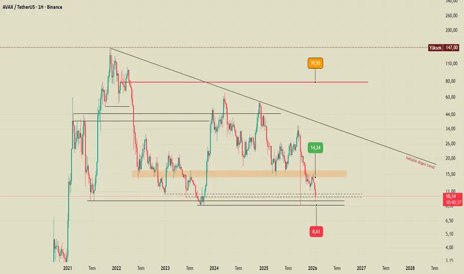 Şimdi de bu son yaptığı tepe noktasından %86 düşmüş durumda 9.16 seviyesini gördü. Bir önceki dip noktasında 8.61 seviyelerinde alıcı bulan AVAX yeniden bu seviyelerde likidite bularak grafikte işaretlediğim haftalık düşen trendi hacimli kırması durumunda %761 artış ile 78,93 seviyesine uzun vadede bir yükseliş bekliyorum.