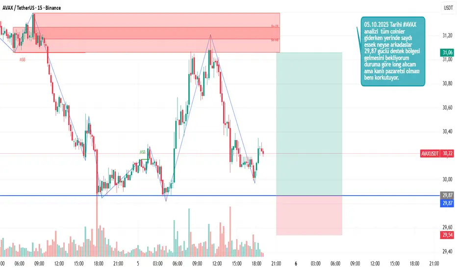 05.10.2025 Tarihi #AVAX analizi tüm coinler giderken yerinde saydı essek neyse arkadaslar 29,87 güclü destek bölgesi gelmesini bekliyorum duruma göre long alıcam ama kanlı pazaretsi olması benı korkutuyor.
