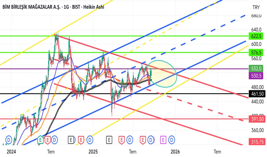 Çok karmaşık olduğunu biliyorum sıkıntı değil ben görüyorum şuan elimizde 3 kanal var 1 trend kanalı (kırmızı) 2 yükselen trend kanalı (mavi) 3 genel büyük yükselen trend kanalı (sari). Sari Kanal çok bir önemi yok bu zmana kadar 2 kez destek olarak çalışmış. Önümüzde önemli bir direnç var 230 (mor çizgi) ama sağlamada bir destekler var. İlki 500 ikincisi 461 ve bı ufak bYrsk var