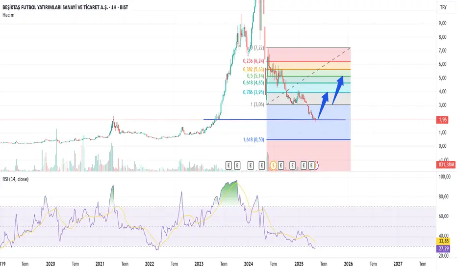 Bjk 2013'den bu yana takibimde olan, 2TL altına düşüşlerde genelde hep x 3 yaparak kısa zamanda prim kazandıran bir hisse. Kısa vadede 1. ve 2. hedefleri Fibo üzerinde ok ile gösterdim. Ekim sonrası 10 TL'ye geri gelirse şaşırtmaz.