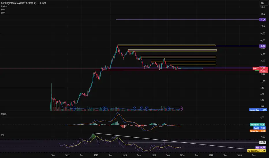 BOBET Haftalık Grafik, Bu grafikte görüldüğü üzere kırmızı çizgi destek olarak çalışmış şimdi ise ilk defa 10 Kasım 2025 te oluşan EMA233 bu haftayla birlikte son 7 haftadır destek olmuş bu süre içerisinde de mor çizgi 19,48 direnç olmuş. EMA 233 destek 19,48 mor çizgi direnç arasında ne kadar süre yatayda gider bilinmez ama bu yatay alanda malı topluyorlar gibi duruyor. Ne zaman işleme girilmeli bana kalırsa uzun vade yatırımı için buralar alım yeri için çok ideal ama en sağlıklı alım yeri 19,48 üstü kapanışlarda işleme girmek daha sağlıklı görünüyor. bir hisseyi alırken ilk yapılması gereken stop-loss u belirlemek burada en güzel stop yeri EMA233 altı gibi duruyor, burayı aşağıya kırması durumunda aşağıdaki kırmızı destek çizgisine kadar inebilir. Hedefler sarı çerçeveli alanlardır.