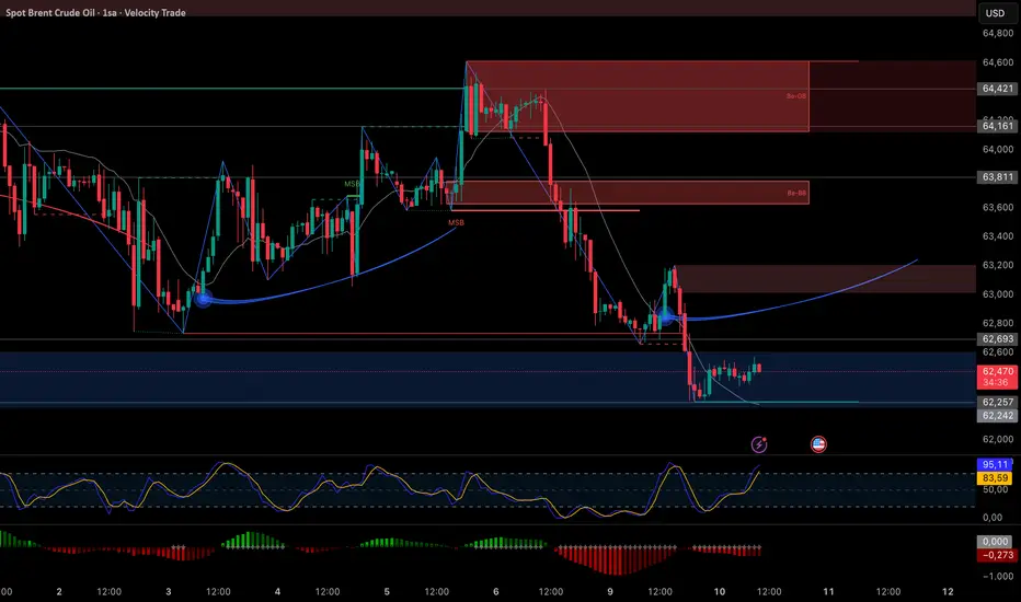 #Brent beklediğim gibi 63.20 kırılımından sonra satış bölgesinden sert reddi aldı ve fiyatı direkt olarak 62.25–62.00 likidite havuzuna itti.