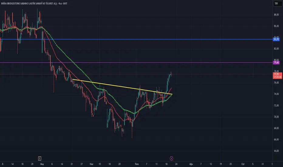 Sarı çizgi üzeri kaldığımız sürece yön yukarı.İlk hedef fibo 1.414 olan 79.60 ana hedef 83.70.Sarı çizgi altı zarar kes.