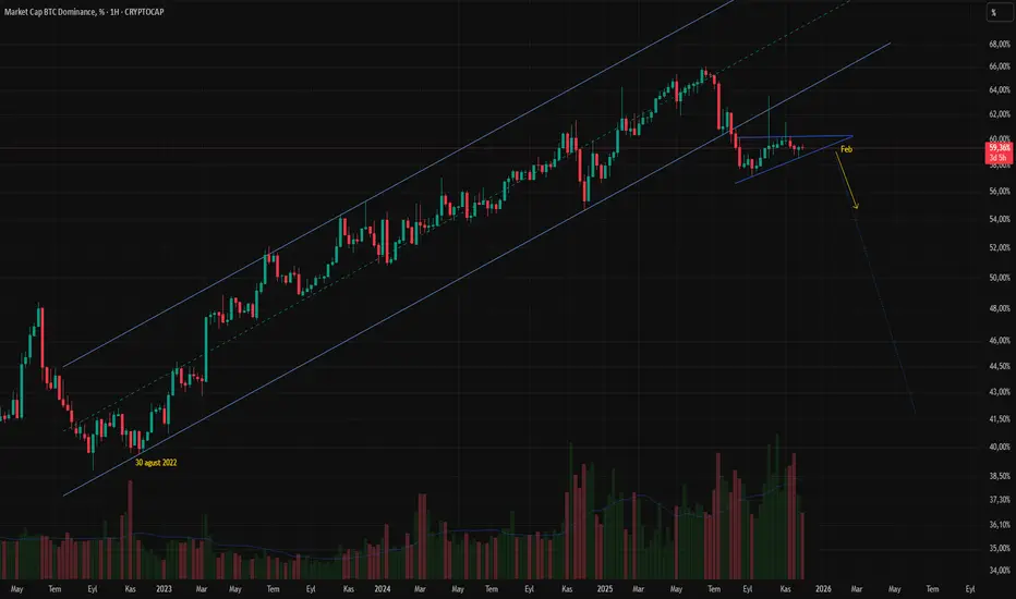 BTC.DOM 2022 ağustostan başlayan yükselen trendi aşağı yönlü ağustos ayında kırmıştık. şimdi çok az kaldı belki şubat ayına kadar biraz daha konsolide olabilir. ytd