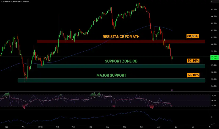 Bitcoin dominansı, %60-61 bölgesindeki güçlü dirençten red yedikten sonra %57,16 seviyesine kadar geriledi...
