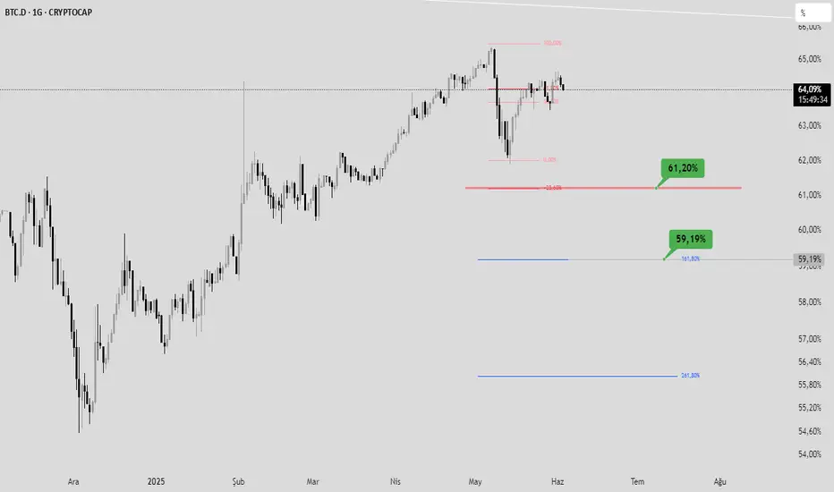 BTC.D Dominans'ta artık düşüşün başladığını düşünüyorum. Hedefler grafikte. Altcoinler için rahatlama rallisi kapıda.