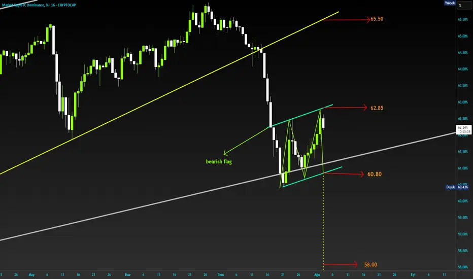 Bu formasyona göre 62.85 üzerine çıkmadığı her ana aşağı düşüş veriyor. Bu nokta çok kritik biliyorsunuz ki ethereum en büyük altcoin o düşmediği için diğer altcoinler ciddi düşüş yaşadı. Zaten buralara kadar düşmesinin sebebi de ethereumdu. Çünkü yüzde 20 hakimiyeti var. Bu yüzde 62.85 seviyesi çok önemli geçilip formasyon bozarsa eğer 65.50 seviyesine kolay ulaşır. Eğer geçemezse de alt limitimiz 60.80 seviyesi. Bu seviyenin altında da 58 seviyesi ardından kademeli olarak 39 a doğru yolculuk başlar. Buranın altına kayıp son bir test trende yapabilir bu arada sorun değil.