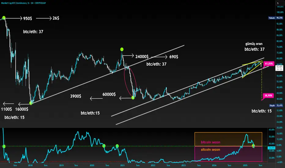 Btc dominans formasyonda trend aşağısına kırdı ve aşağı doğru ilerliyor. Peki kilit nokta neresi? 61 seviyesi. Buradan çoğu kez tepki aldı işte yine alırsa bu sefer dediğim 37 ye geri dönüş başlar. 61 altına düşmedikçe dolu dolu bir altcoin artışı görmemiz biraz zor. Ayrıca Btcnin de 123 bin doları geçmesi şart. Bu şartlar sağlanırsa Btc dominans 39 seviyesine kadar düşüş olabilir. Neden mi ? 3 sezondur aynı seviyede ayı başlattığı için. Tabiki de anlık tabip ediyor olacağız ve düştükçe yeni değerleri hesaplayacağız arada da değerler mevcut.