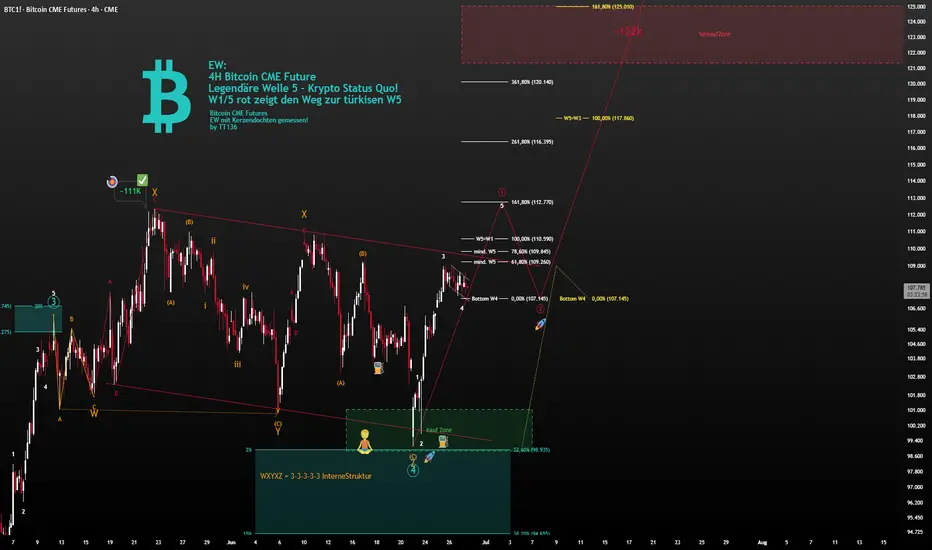 Seit dem kauf bei 99.6k, tracke ich die Interne Wellen-Struktur der Roten Zählung, der ersten Welle 1 der türkisen Welle 5. Die Farbe war vorher grün - rot passt aber besser zu einem Finale. Vor allem soll es das anschließende Massaker ankündigen. 📉💀