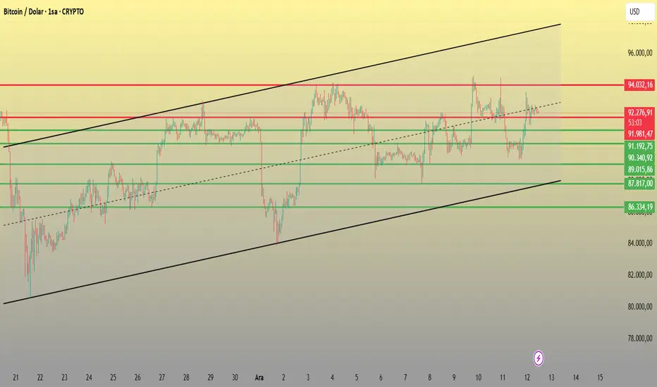Bitcoin, yükselen kanal yapısını koruyarak hareketine devam ediyor. Fiyat şu anda 92.318 civarında ve 91.900 – 92.000 bandı üzerinde kalma çabası dikkat çekiyor. Bu bölge hem kanal orta bandı hem de yatay direnç/destek dönüşümü açısından günün ana karar alanı konumunda.