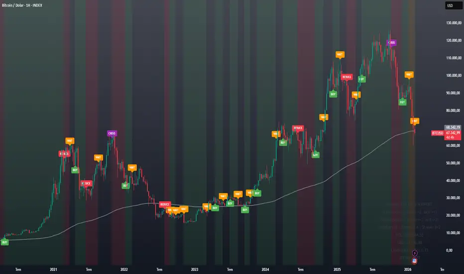 Likidite bol, makro ortam destekleyici. Fiyat 40K civarından 100K'ya kadar tırmandı. BUY sinyali çalıştı. 2024 sonuna doğru WAIT sinyalleri gelmeye başladı. Likidite artık o kadar bol değildi. Ardından REDUCE ve CRISIS sinyalleri peş peşe geldi. Bitcoin zirveyi gördü ve düşüşe geçti.