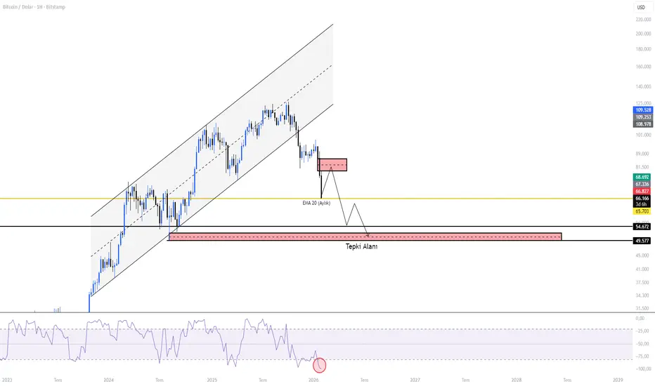 Ana Düşüş Senaryosu: Yukarıdaki likidite alındıktan ve boşluk dolduktan sonra, satış baskısının artmasıyla birlikte fiyatın asıl "Tepki Alanı" olarak belirlediğimiz 54K civarına geleceğini ve bu bölgeden tekrar bir tepki alacağını söyleyebiliriz. Burası güçlü bir destek bölgesi ve burada muhtemel short işleminde olanlar TP alarak karlarını realize edeceklerdir ilk güçlü düşüş hedefi burası. Eğer fiyat geri çekilmezse ve EMA20 altına aylıkta sarkarak ilerleyebilirsede burası en güçlü destek bölgesi olarak çalışacaktır.