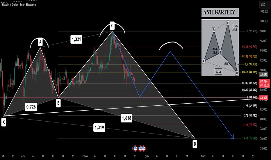 Grafikte birçok şey oluyor, şimdilik bu benim teorim. Şu anda grafikte bir Gartley karşıtı formasyon görüyorum, B bölgesine doğru düşüp sonra sıçrama yapabiliriz, bu sıçrama bizi 90.000 dolarların ortalarına kadar çıkarabilir, bu da 92.940 dolar ile 93.045 dolar arasındaki küçük CME boşluğunu kapatarak B'nin boyun çizgisi olduğu bir Omuz-Baş-Omuz formasyonu oluşturabilir.