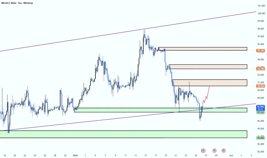🕹️ Genel görünümde fiyat hareketi pozitif seyrini koruyor. Bu nedenle 87.163 destek bölgesindeki fiyat tepkisi, kısa vadeli yön tayini açısından kritik önem taşıyor.