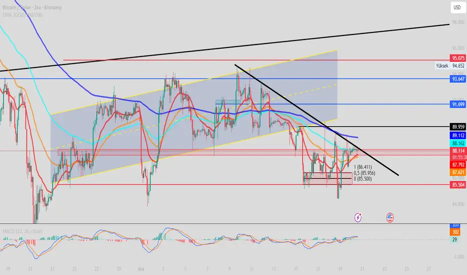 Fiyatın kırmızı kutu ile göstermiş olduğum bölge yukarı yönlü kırılması halinde bahsetmiş olduğum 95.500$'a yükseliş başlar. Bu seviye yükselişlerin devamı için kritik !
