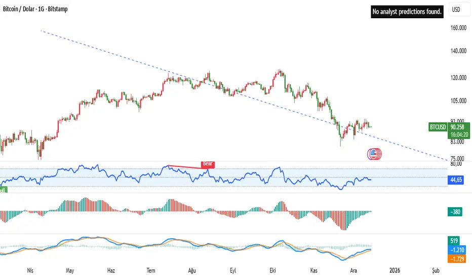 Fiyat hareketi: Güncel fiyat yaklaşık 90.160 USD seviyesinde ve Kasım ayındaki sert düşüşten sonra konsolidasyon sürecinde. Bu yapı, net bir dönüşten ziyade denge / taban oluşturma aşamasına işaret ediyor.