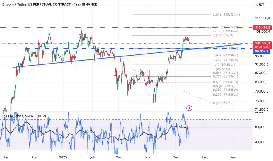 Dönüş için beklediğim seviye 99k. oradan başlayacak hareketin 110 küsür k'ya taşıyıp ath yapmasını bekliyorum. kırmızıdan sonra sert bir düzeltme ile 90'a çekilmesi yönünde düşüncem var. bu grafikte en güvendiğim seviye 99k'dan longa dönüş...