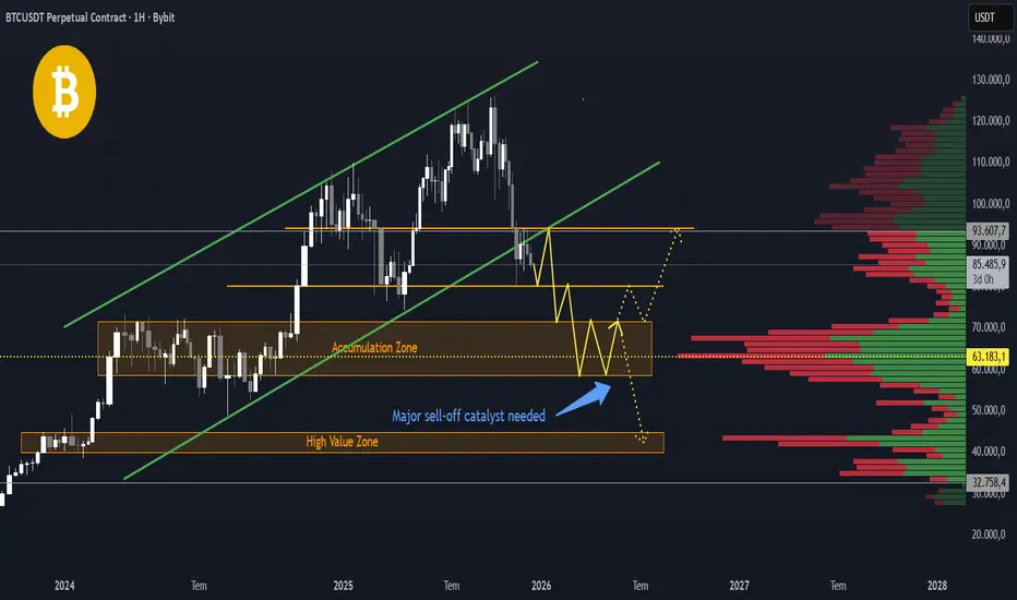65k-75k bölgesi, önceki piyasa yapısı ve hacim profili tarafından desteklenen yüksek olasılıklı bir kabul bölgesini temsil ediyor. Bu alan, piyasa bir sonraki yön hareketine karar vermeden önce uzun süreli bir konsolidasyon aralığı olarak işlev görebilir.