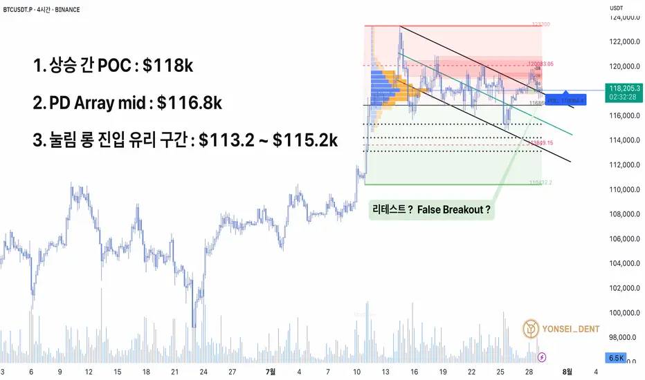 현재 BTC는 중기 하락 채널 상단을 강하게 돌파한 뒤, 그 지점을 되짚는 리테스트 구간에 진입했습니다. 이 자리는 단기 강세 지속 여부를 판단할 수 있는 중요한 경계선입니다.