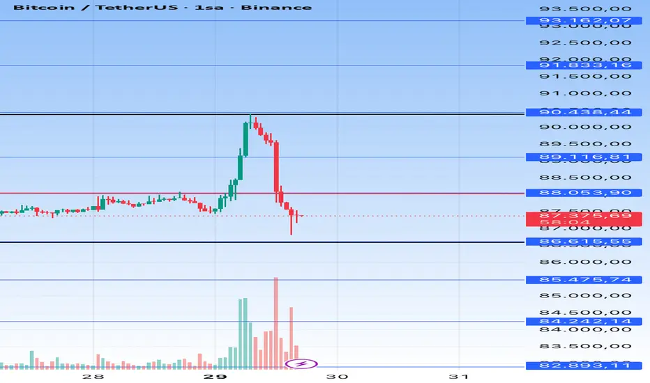 🔻 90.000$ üzeri kalıcılık sağlanamayınca üst banttan red geldi ve fiyat alt banda doğru geri çekildi.