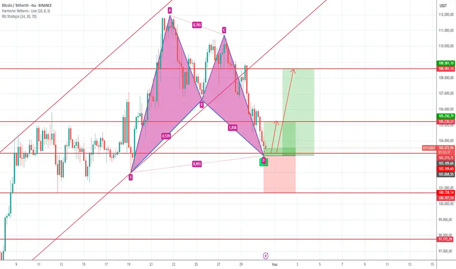 Harmonic bullish bat formasyonu oluşumu tamamlandı , bu baglamda 103,400 seviyesinde bulunan BTC de 100,700 seviyesine inmedikçe yükseliş beklemekteyim 2 kademeli yükseliş beklemekteyim öncelikle 382 fibo seviyesi 105 230 devamında stop'u girişe çekerek 108,580 seviyesi Bol kazançlar