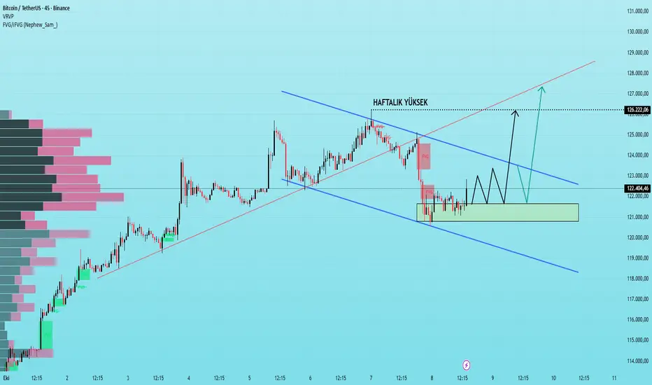45 dakikalık grafikte BTC, haftalık zirveden kısa bir düzeltmenin ardından 122.500 USDT civarında işlem görüyor. Mevcut yapı, aşağı kanal içinde belirgin bir birikim bölgesi gösteriyor ve FVG (Adil Değer Açığı) ile yüksek hacim bölgesinin (VPVR) çakıştığı 121.000 bölgesinde güçlü bir destek bulunuyor.