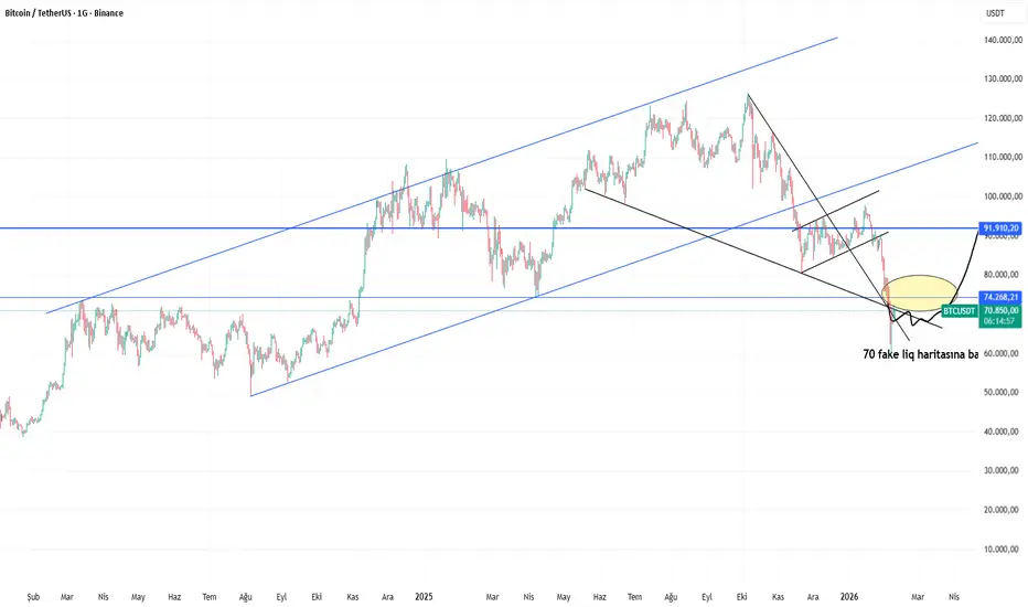 Bitcoin grafiğini bu şekilde takip ediyorum. 70 bin civarına fake hareket bekliyordum kılçık ile 60'a kadar götürdüler 84 bin dolara kadar CME de gap oluştu günlük mum hareketlerinde flama görüntüsü mevcut hareketleri burada takip etmek gerekir. Şubat ayı boyunca temkinli olmak lazım FED vs de yok manipüle edecekleri ortam mevcut Fed vs olsa hareketleri Fed sonrasına saklıyorlar durağan bi dönem oluyor şuan öyle bi dönemde değiliz.